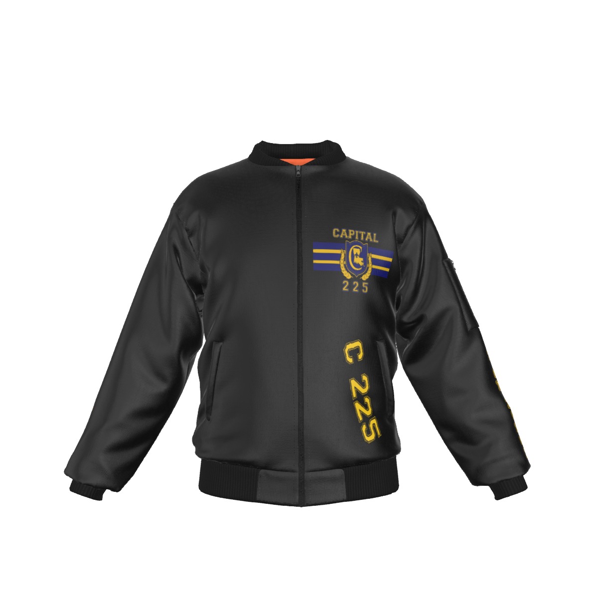 - Black rib-knit, black zipper, pocket with black zipper on left sleeve